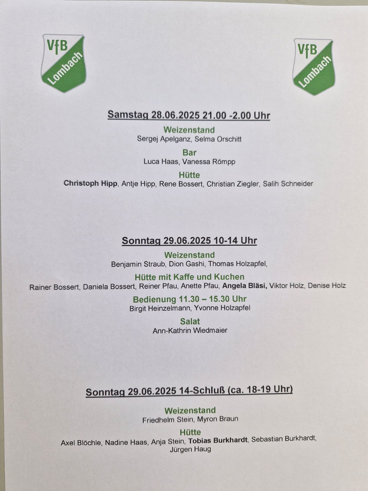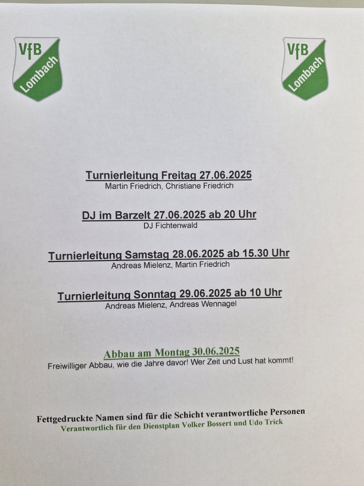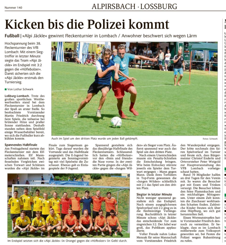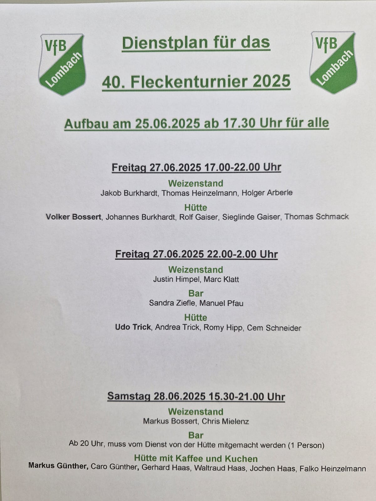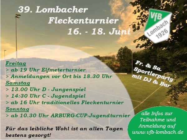 Das traditionsreiche Fleckenturnier des VfB Lombach ist eine Institution in unserem Sportverein und eigentlich nicht aus dem Vereinsleben wegzudenken. Erstmals ausgetragen im Jahr 1978 hat es das Dorfleben seither fast jeden Frühsommer beleben dürfen. Mannschaften wie die Höfbolzer, Siedlung oder Brasils Traumkicker haben es in die Annalen der Vereinschronik geschafft.