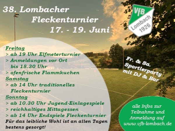 Das traditionsreiche Fleckenturnier des VfB Lombach ist eine Institution in unserem Sportverein und eigentlich nicht aus dem Vereinsleben wegzudenken. Erstmals ausgetragen im Jahr 1978 hat es das Dorfleben seither fast jeden Frühsommer beleben dürfen. Mannschaften wie die Höfbolzer, Siedlung oder Brasils Traumkicker haben es in die Annalen der Vereinschronik geschafft.